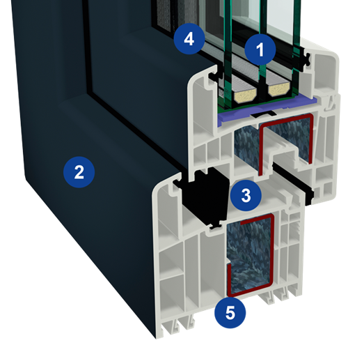 - Sehr gute Wärme- und Schalldämmung durch 6-Kammer-Aufbau und große Bautiefe bei Blendrahmen und Flügel.